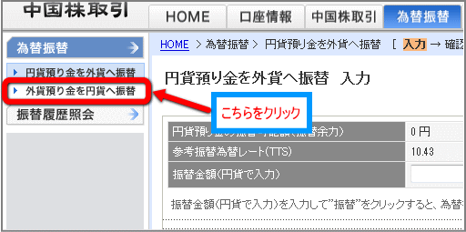 前のページで中国株の売却が終わりました。中国株口座には香港ドルが入っているので日本円に両替と出金をしましょう。 1.まずはマネックス証券の中国株口座にログインします。(ログインまでの手順はこちらのページ1.〜2.を参考にして下さい。)ログインしたら、ページ上にある為替振替クリックします。