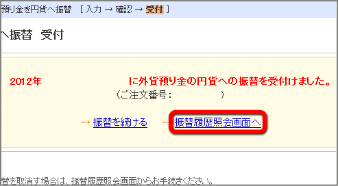 5.振替が受付けされました。「振替履歴紹介画面へ」をクリックするすると、詳細が表示されます。