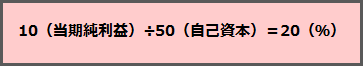 このような計算式で求めれれます。 先ほど出てきたA社を例に計算をしてみましょう。自己資本が50ある企業の当期純利益が10だとします。この場合は…